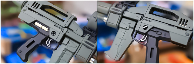 左手グリップにマウントされるマグネットです。この部分は(誤飲防止とかの安全基準のためか?)半完成状態でキットに入っています。ですので加工に制限があります。小さいヤスリを使ったり、地道なマスキングで塗り分けしたり。そしてシールド本体への取付が少々ガタガタするので、ネジで固定します。