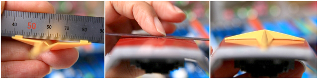 3本のサーベルのうち、中段だけLED発光しています。上段サーベルは無発光ですが、最適化したので光を拾ってます。下段サーベルはノーマル無加工であきらかに集光率低いです。発光効率を大幅に改善できたとおもいます。