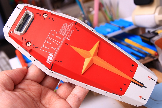 シールド表面はアニメのように柔らかい曲面構成になっていて、とても良い感じ。それにあわせて連邦十字の取付面も湾曲していますが、ただやはり3D曲面同士の取り付けは精度が難しく隙間ができがち。仮組みの段階で何度も何度も調整して、ピッタリ収まるようにしました。