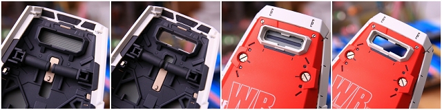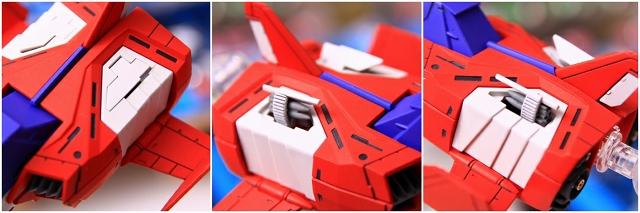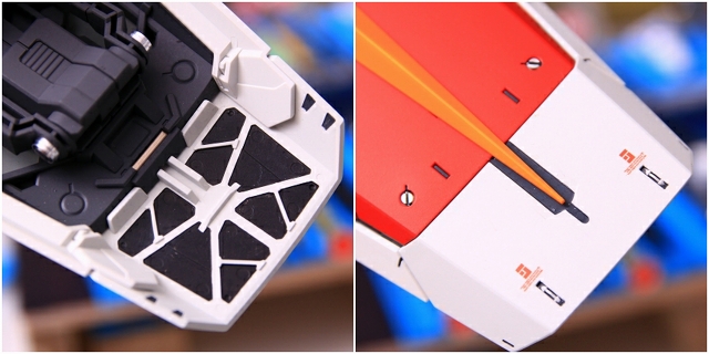 股間の連邦マーク部分は「大気圏突入」で使用した冷却機構が再現されてます。この赤いパーツの上端は、フレームと可動用ハンドラも兼ねているので、グレー等で塗り分けしました。開く時は赤い部分を押し下げて、閉じる時は上端のグレー部分を押すと閉まります。