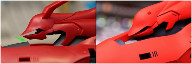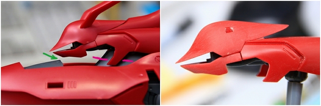 まずは首左右のチンガードを紫線でカットしました。つぎにアゴの下のグレーのフレーム(緑矢印)を加工します。