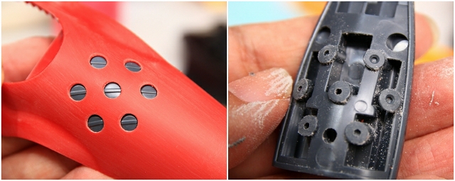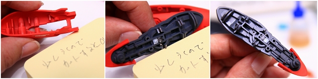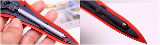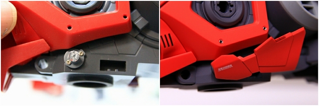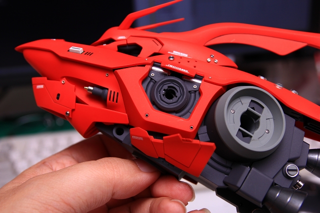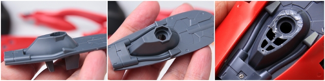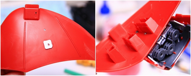 このあたりは全体的にパーツのハメ合いが非常に硬いです。なかなか奥まで入らないし、力まかせにハメこむと分解が困難になります。またムリな応力がかかっていると塗装や経年劣化で割れる可能性も。スカスカくらいまでゆるく加工してから、ネジでしっかり固定しています。