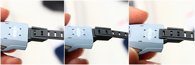 シールド伸縮の縮め方です。シールド下半分を外方向(写真では上方向)に3mmずらすとロックが外れ、縮められるようになります。