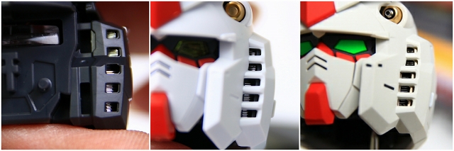 まず頭部の発光についてです。LEDユニットは首の下の胸のあたりに位置します。LEDの光は喉・頭部のクリアーパーツを通り、ツインアイとセンサー前後を光らせる構造です。