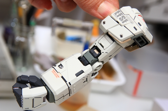 手首のブロックは白一色で、このスケールだと間延びしてしまうので、グレーで塗り分けました。成形の甘いディテールは、マイナスモールドやPPアポジなどのメタルパーツに置き換え。メッキパーツはムラがあり超合金オモチャっぽい質感なので、メッキを落としてグレーやゴールドに再塗装。肘後ろ側のカバーは、複雑かつ良い感じのパーツ構成。微調整だけ加えています。