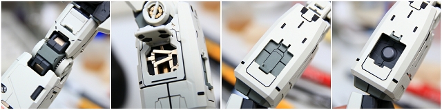 ヒザ裏はアドバンスドMSジョイントが露出します。アドバンスドMSジョイントは素材がPE・PPなので加工や塗装ができません。なので、できる限りの整形や色合わせを行いました。また周囲の色を目立たせることでPEPP部分を目立たなくさせるなど、境界色干渉なども利用しました。