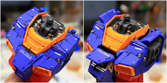 ノーマルは大河原的アニメ的表情です。首周りを改造し可動範囲拡大することで、アゴが引けるようになり、カトキハジメ版のような表情もできるようにしました。