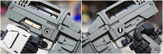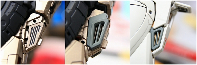 前腕には金属プレス製パーツが仕込まれています。これがシールド側の磁石で結合される仕組みです。磁力の強さは静かにディスプレイには十分ですが、移動やポーズ変更するときは外れ落ちるかもしれませんので注意してください。金属プレスパーツはスライドハッチを閉じると隠れます。