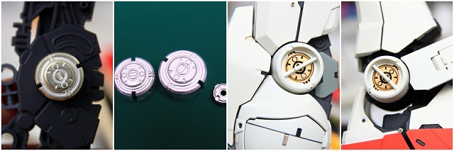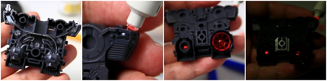 LED内蔵ビームサーベルを差し込むことで、光がバックパック内クリアーパーツを通り、ノズルが光る仕組み、しかし導線が長いため光量が少ない。また消灯するとクリアーレッドパーツのオモチャっぽいディテールが目立ってしまう。ですので発光ギッミックはオミットすることにしました。