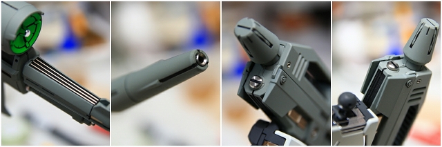 ガンプラでは初(?)のメタルディテール。取り付け方法に凝ってフランジなどを設けたのはいいのですが、その代償として奥行がまったくなく、穴底が丸見えで、せっかくのメタルパーツの効果が出てません。そこで、マズル内部をグレーで塗装し、インナーにステンレス製PPアポジ1.5mmを埋め込みました。