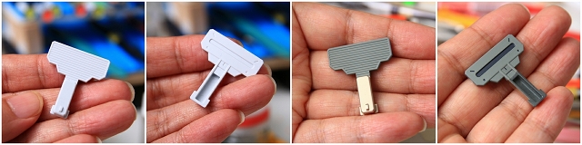 写真の青で囲った2箇所は、よほどうまく組み付ければギリギリ正常に動きそうな設計だと思います。ですが実際に可動させると白いプレートと干渉し、可動が閉じなくなります。ここはスリット状にカットアウトして干渉を解除、スムーズに可動できるように改善しました。