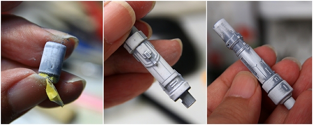 左手グリップにマウントされるマグネットです。この部分は(誤飲防止とかの安全基準のためか?)半完成状態でキットに入っています。ですので加工に制限があります。小さいヤスリを使ったり、地道なマスキングで塗り分けしたり。そしてシールド本体への取付が少々ガタガタするので、ネジで固定します。