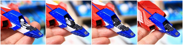 中央コクピットハッチの可動です。まず上に3mmくらい持ち上げて、それから前方に5mmくらいずらします。そこからはある程度自由に動きます。ただ、ここは可動させずハッチを開閉するだけのほうがバランスが良いと思います。