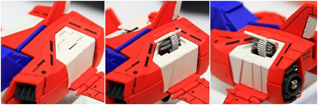 股間の連邦マーク部分は「大気圏突入」で使用した冷却機構が再現されてます。この赤いパーツの上端は、フレームと可動用ハンドラも兼ねているので、グレー等で塗り分けしました。開く時は赤い部分を押し下げて、閉じる時は上端のグレー部分を押すと閉まります。