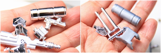 シリンダーシャフトのクロムメッキはムラもなく表面仕上がりもいい感じなので、メッキを活かし、マウント部をグレーで塗り分けました。シリンダーケースはメッキのムラが目立つので、メッキ落としてゴールドで再塗装。