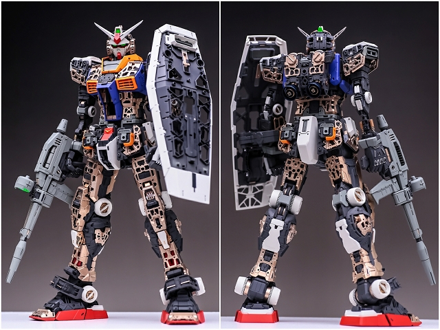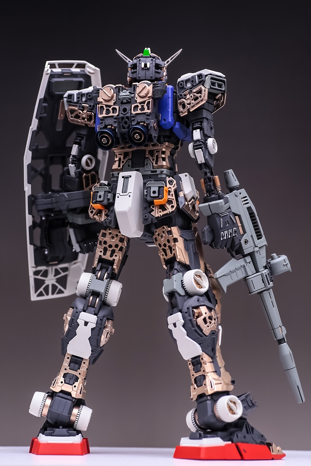 完成写真は一見するとキットノーマルと変わらないようですが、この立ち方をさせるには可動範囲改造とフレームの改造が必要でした。可動範囲を大きくするだけではダメで、体幹軸を真っ直ぐにしたり、逆に意図的にずらしたりなどの微調整も必要。調整を何十回行いました、納得できるまでやって良かったです。