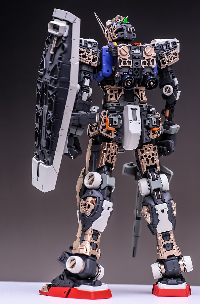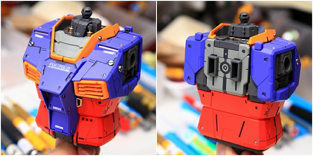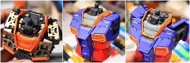 胴体には手足・首・コアブロック・バックパックなど多くのアッセンブルが取り付く上に、さまざまな可動もあるため、少々強度が足りずグラグラします。なので全体的な強度をアップさせる工作に重点を置きました。肩甲骨の2重可動、腰の赤部分のスイング伸縮、上半身と下半身をつなげるプレートフレームなどを改善しました。