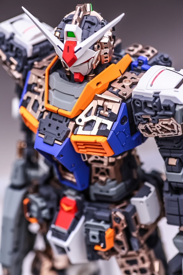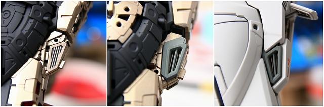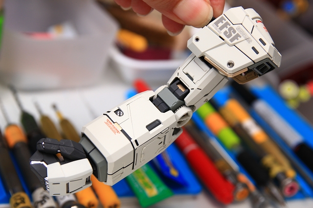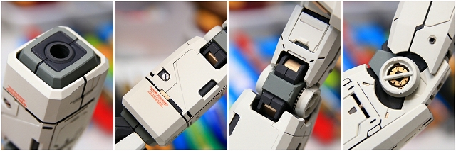 手首のブロックは白一色で、このスケールだと間延びしてしまうので、グレーで塗り分けました。成形の甘いディテールは、マイナスモールドやPPアポジなどのメタルパーツに置き換え。メッキパーツはムラがあり超合金オモチャっぽい質感なので、メッキを落としてグレーやゴールドに再塗装。肘後ろ側のカバーは、複雑かつ良い感じのパーツ構成。微調整だけ加えています。