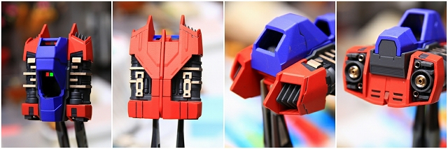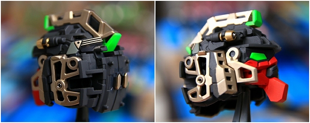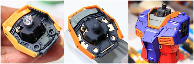 まず頭部の発光についてです。LEDユニットは首の下の胸のあたりに位置します。LEDの光は喉・頭部のクリアーパーツを通り、ツインアイとセンサー前後を光らせる構造です。
