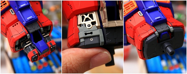 ヒザ裏はアドバンスドMSジョイントが露出します。アドバンスドMSジョイントは素材がPE・PPなので加工や塗装ができません。なので、できる限りの整形や色合わせを行いました。また周囲の色を目立たせることでPEPP部分を目立たなくさせるなど、境界色干渉なども利用しました。