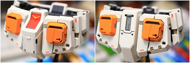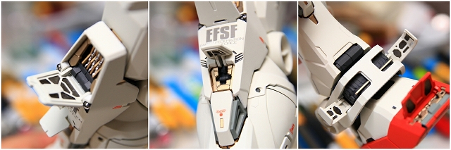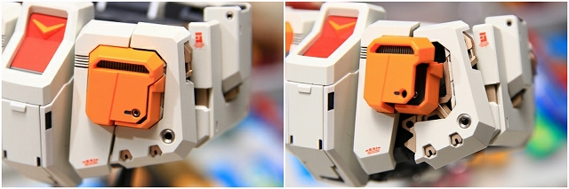 前腕には金属プレス製パーツが仕込まれています。これがシールド側の磁石で結合される仕組みです。磁力の強さは静かにディスプレイには十分ですが、移動やポーズ変更するときは外れ落ちるかもしれませんので注意してください。金属プレスパーツはスライドハッチを閉じると隠れます。