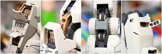 あと胸上面左右のハッチも本来なら可動するのですが、今回は固定しています。なぜかというと、可動のためのジョイントが致命的に弱いからです。自分はPGUGを10体以上作っており、それなりに研究・経験・理解していますが、ここだけは構造的に改善が非常に難く、組み立てや開閉時にどんなに慎重にやっても壊れるときはあっさりポロリと壊れます。もし完成品納品後に破損すると修理も大変。リスクが高すぎることを考慮して、今回はクローズ固定で仕上げました。