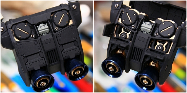 ガンプラ初(?)のメタルノズル。たぶんアルミにブルーのアルマイト。重量感のあるメタリックでとても良いコーティングです。内側にはLED発光のためのクリアーレッドのパーツ。しかし発光効率が悪くほとんど光らないので、発光はオミット。