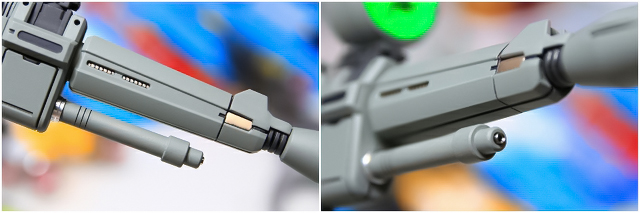 サイドジャケットは一部フレーム色が露出してます。そうデザインしたのか、キットの色分けの限界なのかは不明です。ここは自分の好みで白に塗り分けました。上下スライドの可動は残してあります。