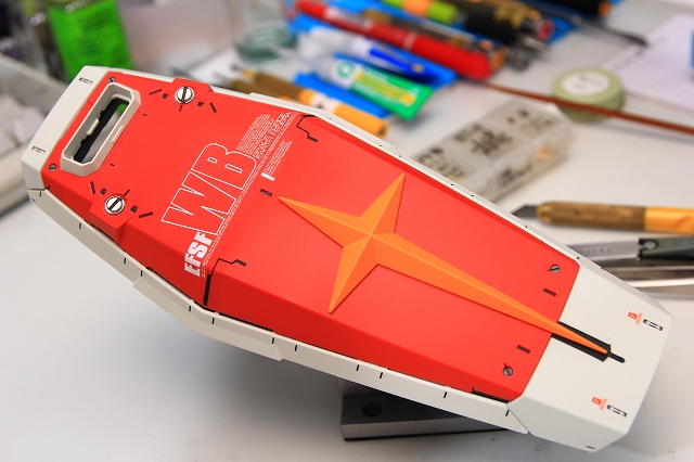 シールド表面はアニメのように柔らかい曲面構成になっていて、とても良い感じ。それにあわせて連邦十字の取付面も湾曲していますが、ただやはり3D曲面同士の取り付けは精度が難しく隙間ができがち。仮組みの段階で何度も何度も調整して、ピッタリ収まるようにしました。