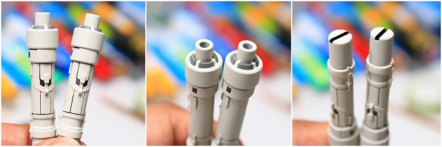 サーベルは3本あります。そのうち1本(右端)がLED発光内蔵サーベルです。発光サーベルはディテールも素材も違います。この素材はあまり経験がない、なにかの繊維を織り込んだような不思議な硬さがありました。そのため加工や塗装の感覚がだいぶ違ったのですが、できるだけ3本が揃うように処理しました。