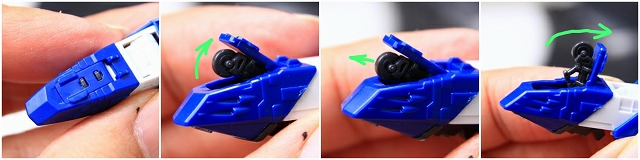 中央コクピットハッチの可動です。まず上に3mmくらい持ち上げて、それから前方に5mmくらいずらします。そこからはある程度自由に動きます。ただ、ここは可動させなくてもバランス良いと思います。
