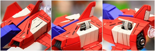股間の連邦マーク部分は「大気圏突入」で使用した冷却機構が再現されてます。この赤いパーツの上端は、フレームと可動用ハンドラも兼ねているので、グレー等で塗り分けしました。開く時は赤い部分を押し下げて、閉じる時は上端のグレー部分を押すと閉まります。