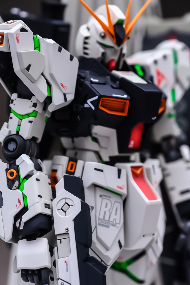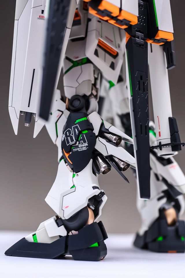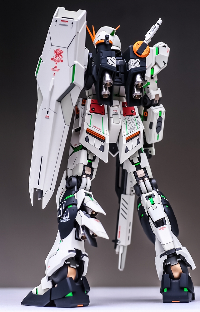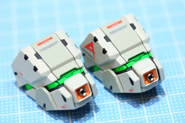 組み立ててみると、なんかボヤッと感じました。その原因はペールグリーンメタリックとサイコフレームグリーンでグリーン2色が色カブりしてるようです。こういうのは塗装して組み立ててみるまでわからないですね。というわけでメタリックを減らしてグレーの塗り分けにしました。今回はこれで正解でした。
