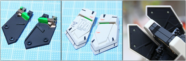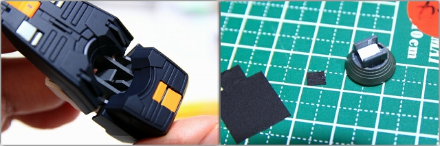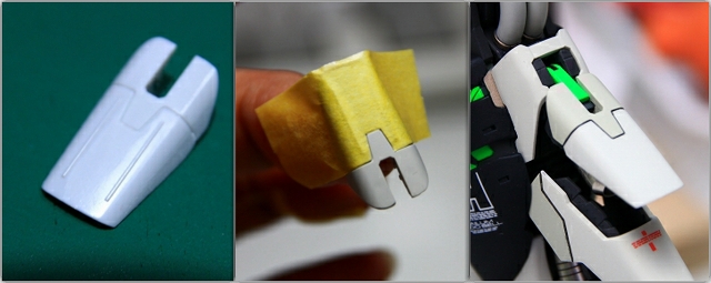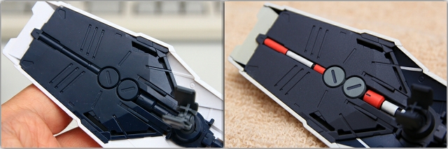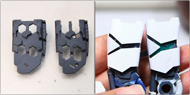 左がノーマルの状態。単調な板状でコントラストが少ないので改善します。スナップフィット用の切り欠きがほんのちょっとだけど見えるのが気になるのでパテで埋め。下半分をプラチナメタリックで塗り分け。