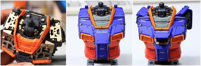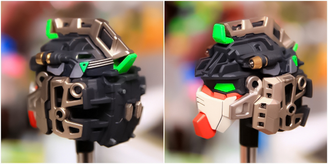 ノーマルは大河原的アニメ的表情です。首周りを改造し可動範囲拡大することで、アゴが引けるようになり、カトキハジメ版のような表情もできるようにしました。