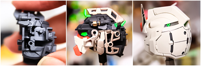 まず頭部の発光についてです。LEDユニットは胸のあたりに位置します。LEDの光は胸・首・頭部のクリアーパーツを通り、ツインアイと前後のセンサーを光らせる構造です。