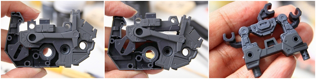 ほぼすべてのスナップフィットをMKカットしてクリアランス調整、スルスルピタッと組み立つようにしました。接着剤は使用しません、なぜなら経年劣化するからです。固定はネジで行い、可動部にはグリスアップ。こういった処理を全身に行っています。