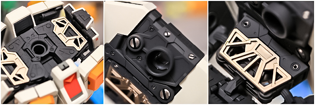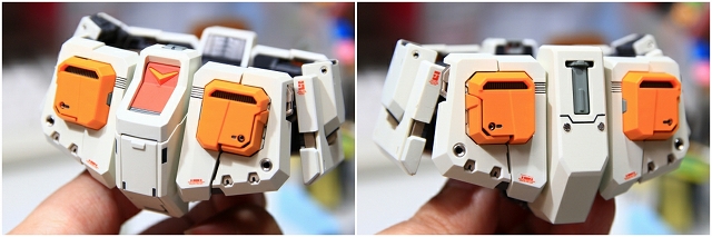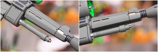 前腕には金属プレス製パーツが仕込まれています。これがシールド側の磁石で結合される仕組みです。磁力の強さは静かにディスプレイには十分ですが、移動やポーズ変更するときは外れ落ちるかもしれませんので注意してください。金属プレスパーツはスライドハッチを閉じると隠れます。