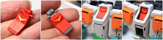 股間の連邦マーク部分は「大気圏突入」で使用した冷却機構が再現されてます。この赤いパーツの上端は、フレームと可動用ハンドラも兼ねているので、グレー等で塗り分けしました。開く時は赤い部分を押し下げて、閉じる時は上端のグレー部分を押すと閉まります。