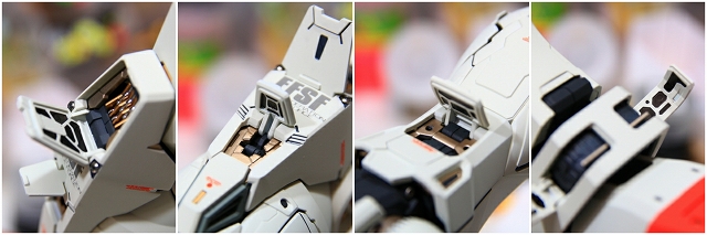 手首のブロックは白一色で、このスケールだと間延びしてしまうので、グレーで塗り分けました。成形の甘いディテールは、マイナスモールドやPPアポジなどのメタルパーツに置き換え。メッキパーツはムラがあり超合金オモチャっぽい質感なので、メッキを落としてグレーやゴールドに再塗装。肘後ろ側のカバーは、複雑かつ良い感じのパーツ構成。微調整だけ加えています。