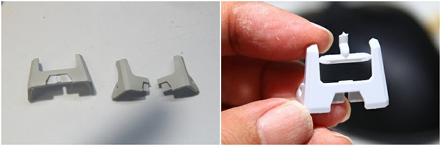 アキレス腱をカバーするパーツは中央部分が割れやすくなってます。ここもスナップフィットで応力(無理な力)がかかるので、完成後も溶剤浸透や経年で割れる可能性があります。対策としてランナーを残したままヤスリがけ、スナップフィットの応力の解除、浸透性の低い塗料などで対策します。