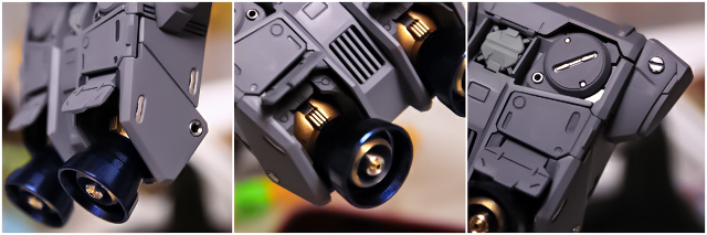 足裏はパーツ分割・色分け・マイナスモールドなどけっこう手が込んでいます。しかしディテールが甘かったり、クリアーパーツなのに発光しなかったりと、おもちゃ感も残っています。モールドを切り落としてステンレス製パーツに交換したり、塗り分け追加したり。