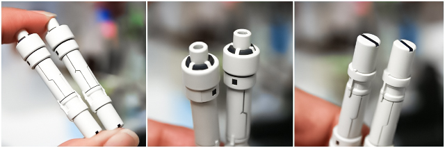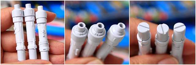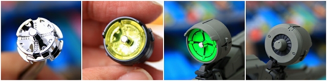3本のサーベルのうち、中段だけLED発光しています。上段サーベルは無発光ですが、加工して効率化したので光を拾ってます。下段サーベルはノーマル無加工であきらかに集光率低いです。ビームの表現を大幅に改善できました。