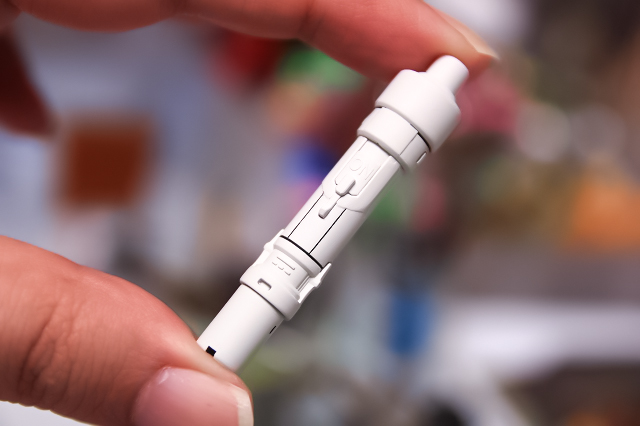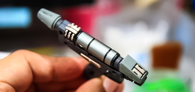 この発光するサーベルは電気的な安全対策のためか素材が独特です。なにかの繊維を織り込んだような不思議な硬さがあり、加工や塗装がけっこう難しいです。分解もできないので、安全に加工できる範囲で処理しました。