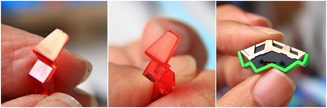 足裏はパーツ分割・色分け・マイナスモールドなどけっこう手が込んでいます。しかしディテールが甘かったり、クリアーパーツなのに発光しなかったりと、おもちゃ感も残っています。モールドを切り落としてステンレス製パーツに交換したり、塗り分け追加したり。