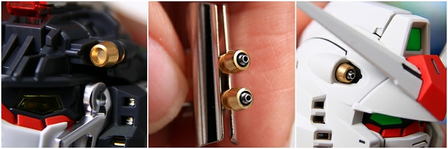 前腕には金属プレス製パーツが仕込まれています。これがシールド側の磁石で結合される仕組みです。磁力の強さは静かにディスプレイには十分ですが、移動やポーズ変更するときは外れ落ちるかもしれませんので注意してください。金属プレスパーツはスライドハッチを閉じると隠れます。
