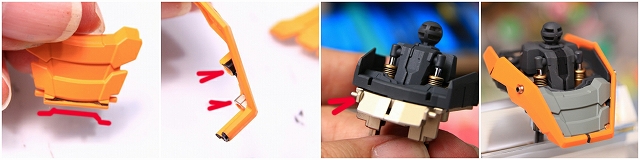 写真の青で囲った2箇所は、よほどうまく組み付ければギリギリ正常に動きそうな設計です。ですが実際に可動させると白いプレートと干渉し、可動が閉じなくなります。原因は白プレートが可動するときに浮き上がりやすい構造になっているからです。白パーツの改善は難しいので、黄色パーツをスリット状にカットアウトするほうが良いです。これで干渉を解除しスムーズに可動できるように改善できました。