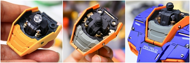 まず頭部の発光についてです。LEDユニットは胸のあたりに位置します。LEDの光は胸・首・頭部のクリアーパーツを通り、ツインアイと前後のセンサーを光らせる構造です。