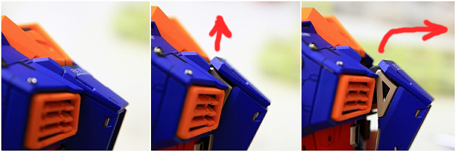 中央コクピットハッチの跳ね上がり可動について。まず上に3mmくらい持ち上げて、それから前方に5mmくらいずらします。そこからはある程度自由に動きます。