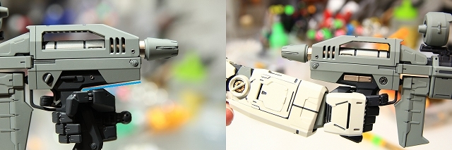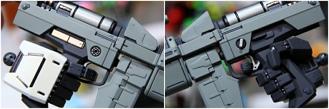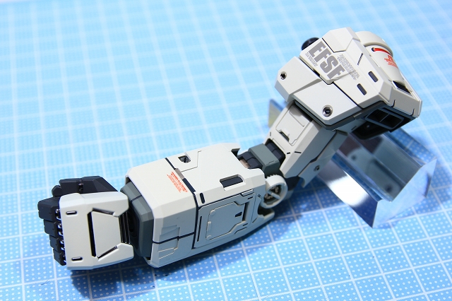 マニピュレータ。キットノーマルでは、クロムメッキ+グレー指+ネイビーブルーの手甲、とうい配色になっています。しかし指と手甲はほとんど真っ黒で見分けがつかない。さらにクロムメッキとのコントラストが強すぎて、メリケンサックを握ってるようにも見えます。